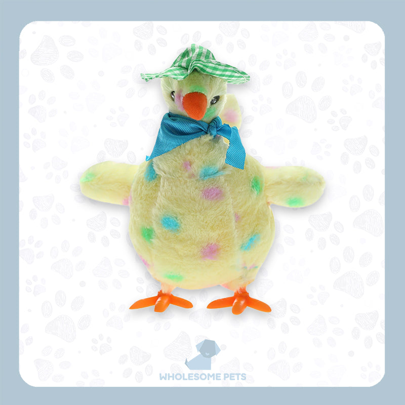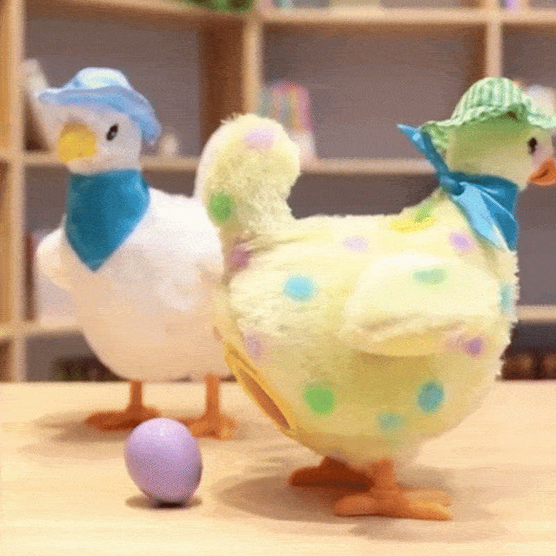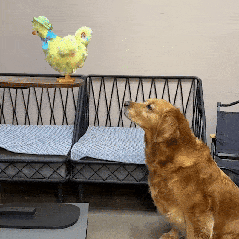 鶏のおもちゃを高い所に置きます。卵が「産まれて」落ちたら、ワンちゃんがキャッチして楽しみます。